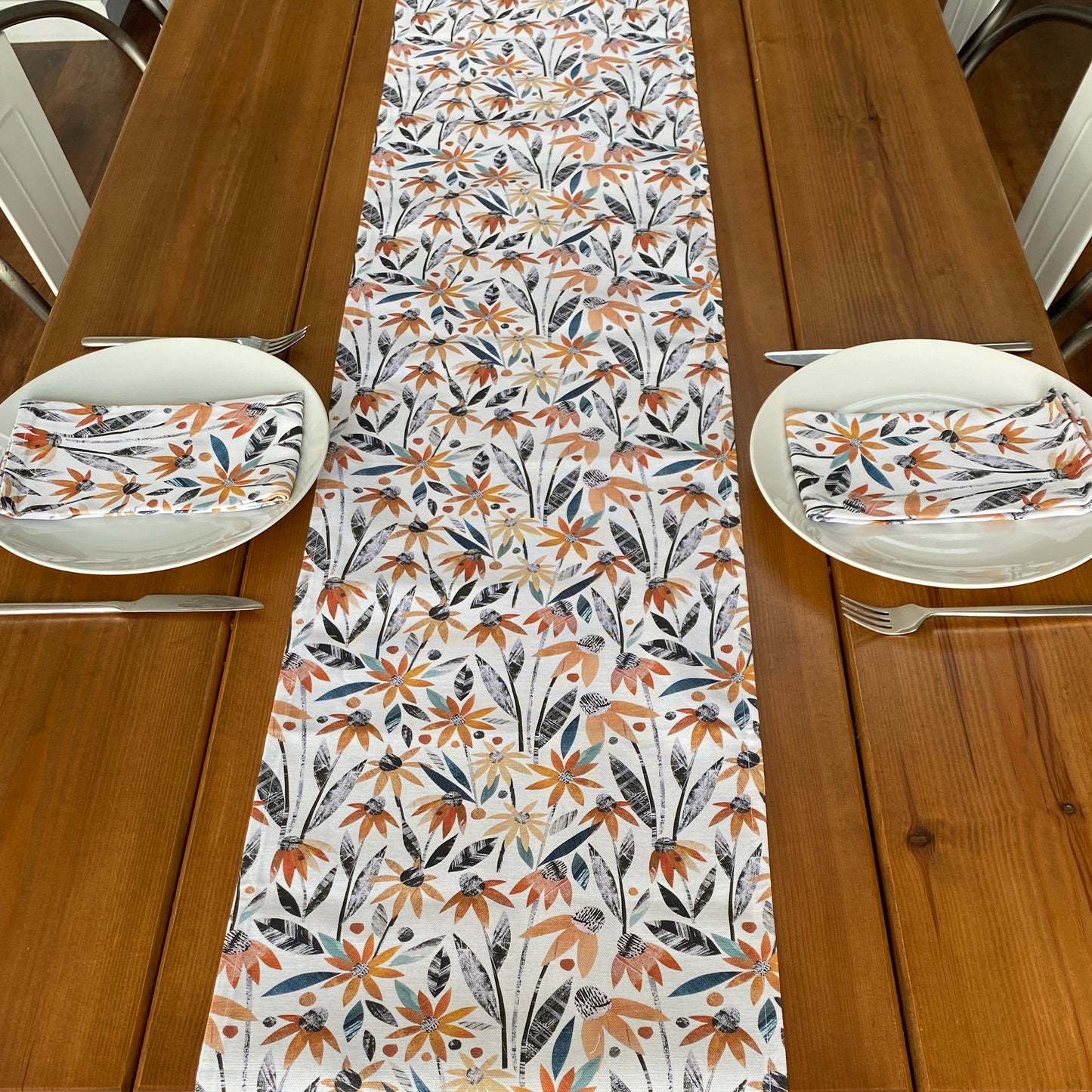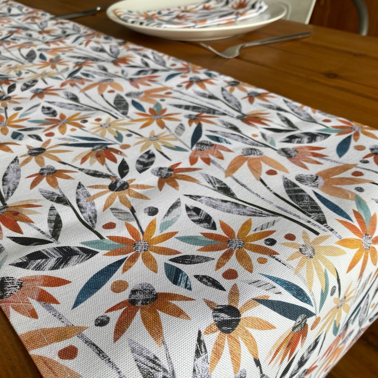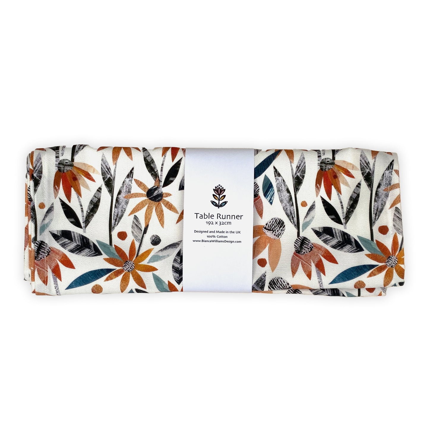 Elevate your dinner or tea party with this elegant Autumn Floral Table Runner. Adorned with rich Orange Rudbeckia flowers in Bianca's exclusive collaged patterns, it adds a sophisticated touch to any occasion.